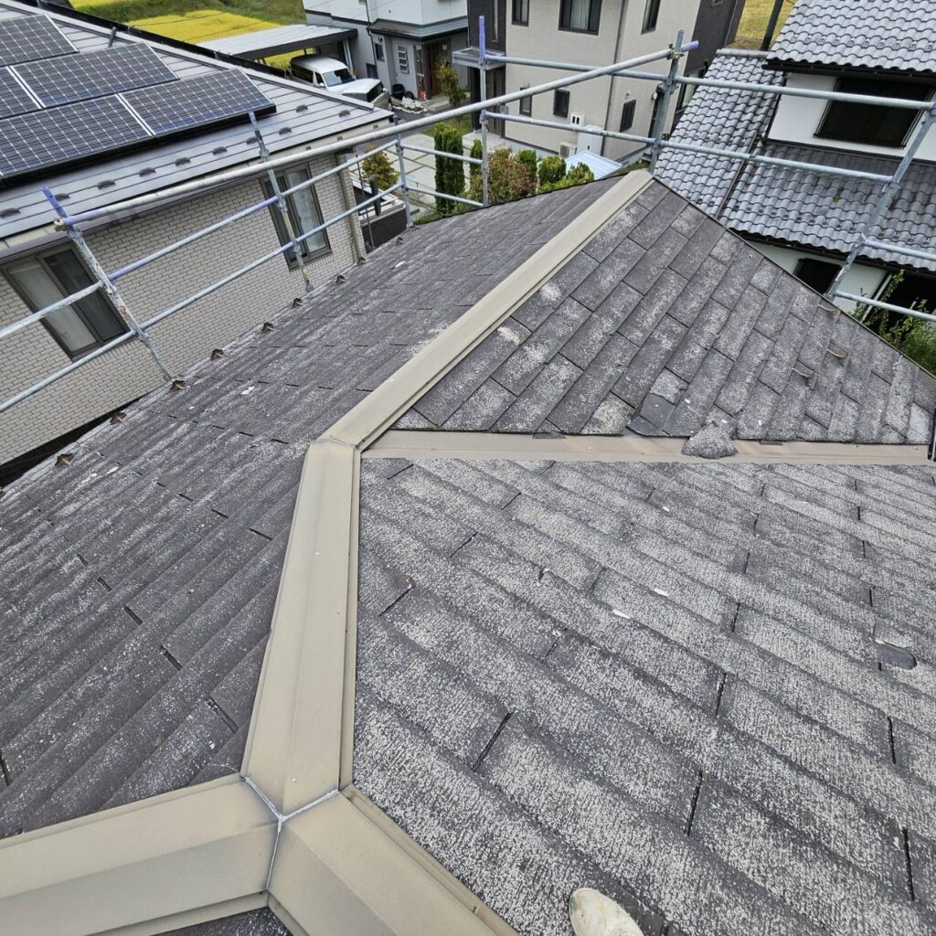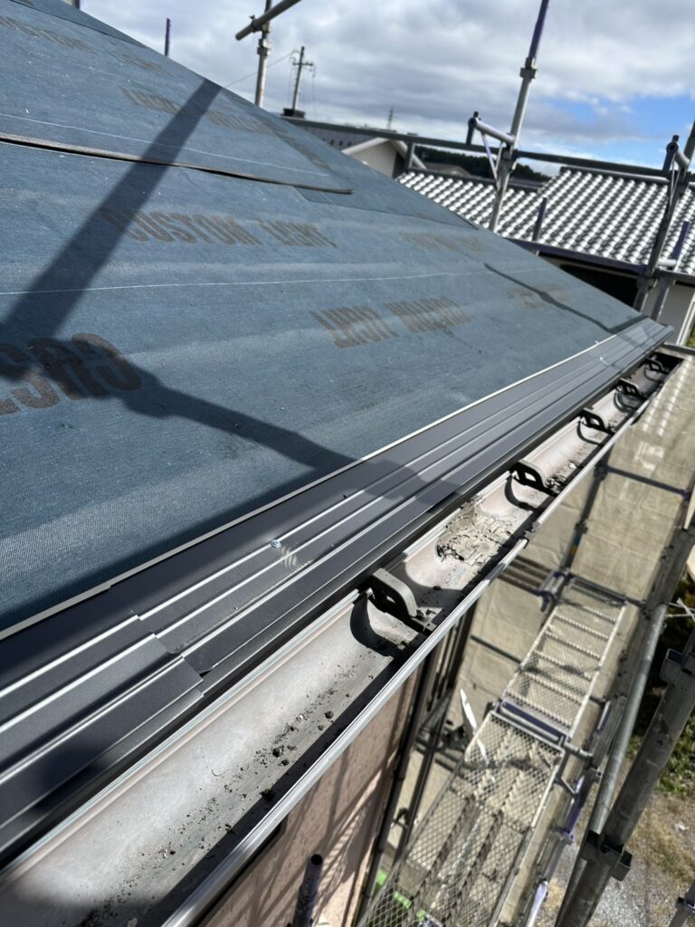 屋根の先端唐草も今回はしっかりしたものを被せて雨樋にしっかり水が落ちるように施工しました。