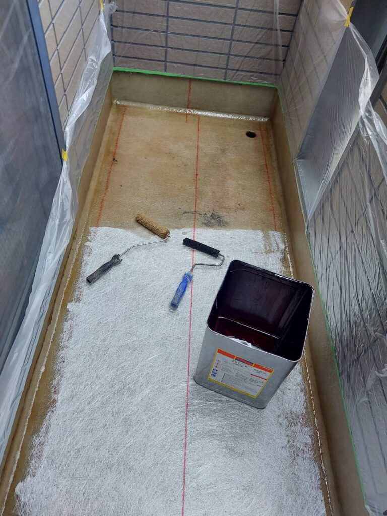 既存のベランダにグラスウールを増し張りして下地を作りFRP樹脂を塗り脱法して
